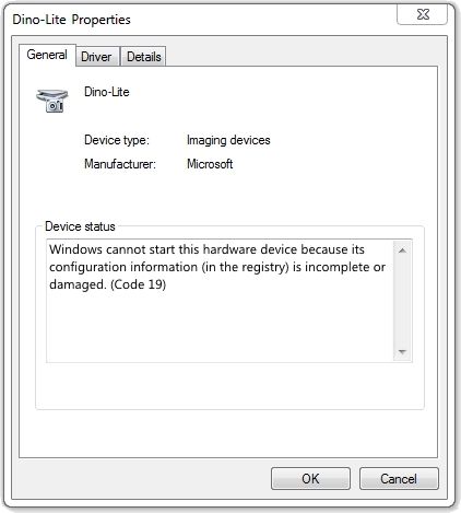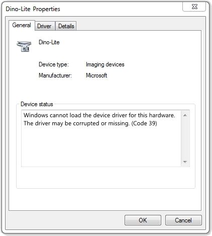 Dino-Lite does not turn on and device manager reports error code 19 or 39.