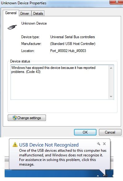 Windows has stopped this device because it has reported problems. (Code 43).