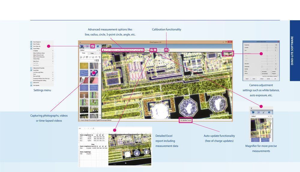 Et professionelt, pålideligt softwaremiljø er essentielt når der arbejdes med computertilbehør, som et USB-mikroskop. Alle Dino-Lite USB-produkter er udstyret med en internt udviklet softwarepakke. DinoCapture softwaren forbedres løbende, er gratis for Dino-Lite-brugere og har en automatisk opdateringsfunktion.