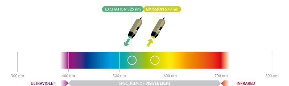 Compared to the traditional fluorescence microscope's band-pass type of emission filters, the Dino-Lite's long-pass type emission filter provides visibility and sensitivity over a larger range of the fluorescence wavelength. The AM4115T-YFGW has the capability of switching the light source from the 525nm green excitation LED's to the white LED, which is convenient for locating the object and obtaining an easy focus.