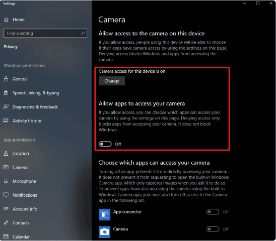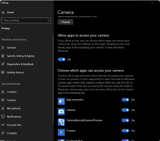 4 - Under the setting Allow apps to access your camera Change the toggle toon
