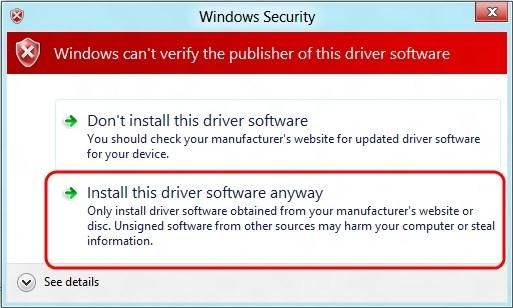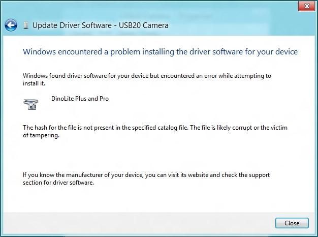 There may be additional procedures when installing the driver for Dino-Lite AM3XX or AM4XX series on Windows 8 due to changes in the default settings in Windows security. You may encounter a security message as shown below: "Windows encountered a problem installing the driver software for your device". This FAQ provides procedures to change the setting to allow the Dino-Lite AM3XX / AM4XX driver to be installed.