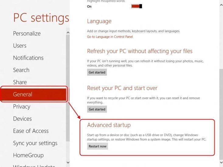 - Open the Settings panel (Press Windows Logo + I). Choose "More PC Settings" (at the bottom) > Select "General" > look for the Advanced startup section and press "Restart now".