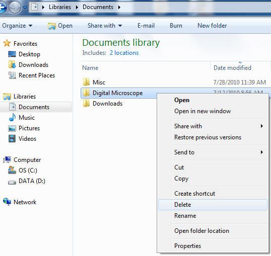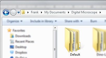 To backup the picture and videos, locate the main folder created with the DinoCapture 2.0 software containing the sub-folders Picture and Video, then copy the main folder to the destination by using the file manager such as Window Explorer. For example, the main folder initially created by DinoCapture 2.0 software is named Default located in the user's My Documents > Digital Microscope, as shown below.