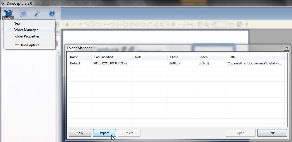 The backup folder can be imported later into the DinoCapture 2.0 by using the Import function in the Folder Manager of DinoCapture 2.0. -