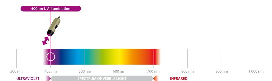 De VW serie heeft 2 verschillende LED lichten, een wit licht en een UV licht, waar tussen geschakeld kan worden. Dit model heeft een filter dat het weerkaatsende UV licht uitfiltert, zodat een beeld met natuurlijke kleuren kan worden verkregen.