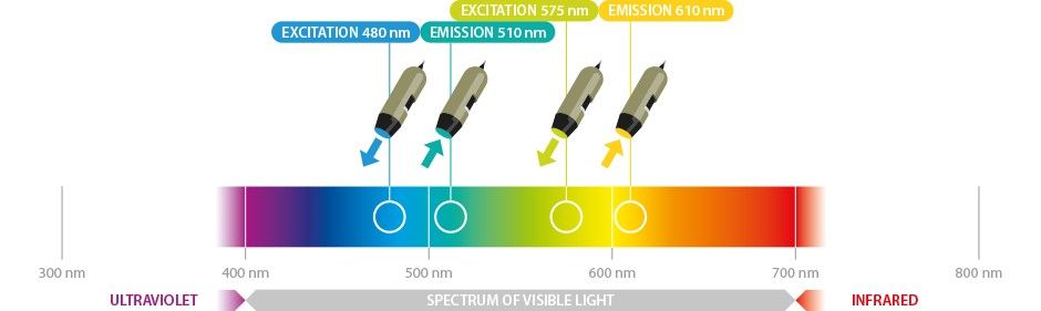 De AM4115T-GRFBY kan de lichtbron wisselen van de 480nm excitatie LEDs naar de witte 575nm LED, wat handig is voor dual color stained fluorescentie. Al deze factoren maken de AM4115T-GRFBY de kleinste fluorescentiemicroscoop ter wereld, geschikt voor vele toepassingen en het zichtbaar maken van een breed fluorescentiespectrum.